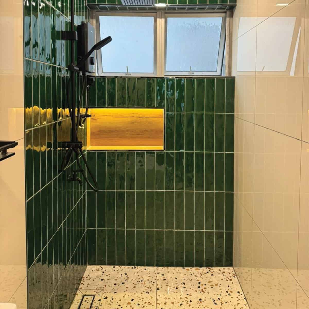 Highlight built-in shelves or recesses with stylish mosaic tiles.